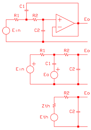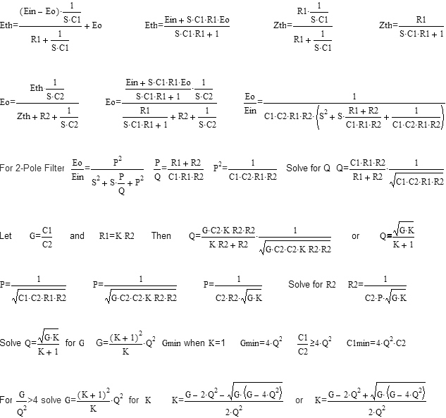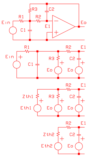 The schematic diagrams shows the filter and the equivalent circuits for the mathematical derivation of the Sallen-Key circuit. The circuit equations can be derived using loop, node or a Thevenin's equivalent circuit. The Thevenin's method has been used.